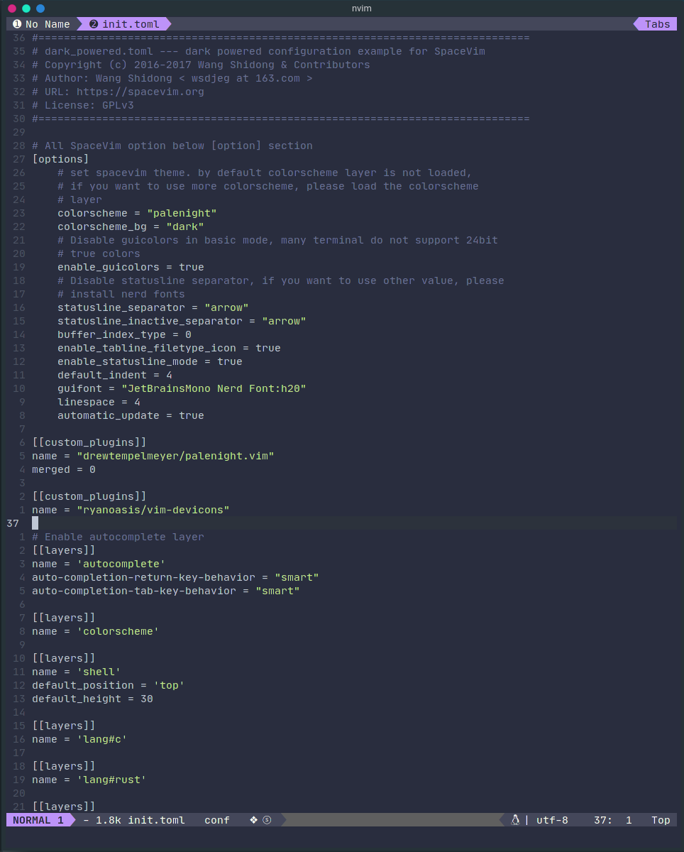 palenight 으로 바뀐 spacevim 에서 init.toml 파일을 열면 다음과 같이 보인다.