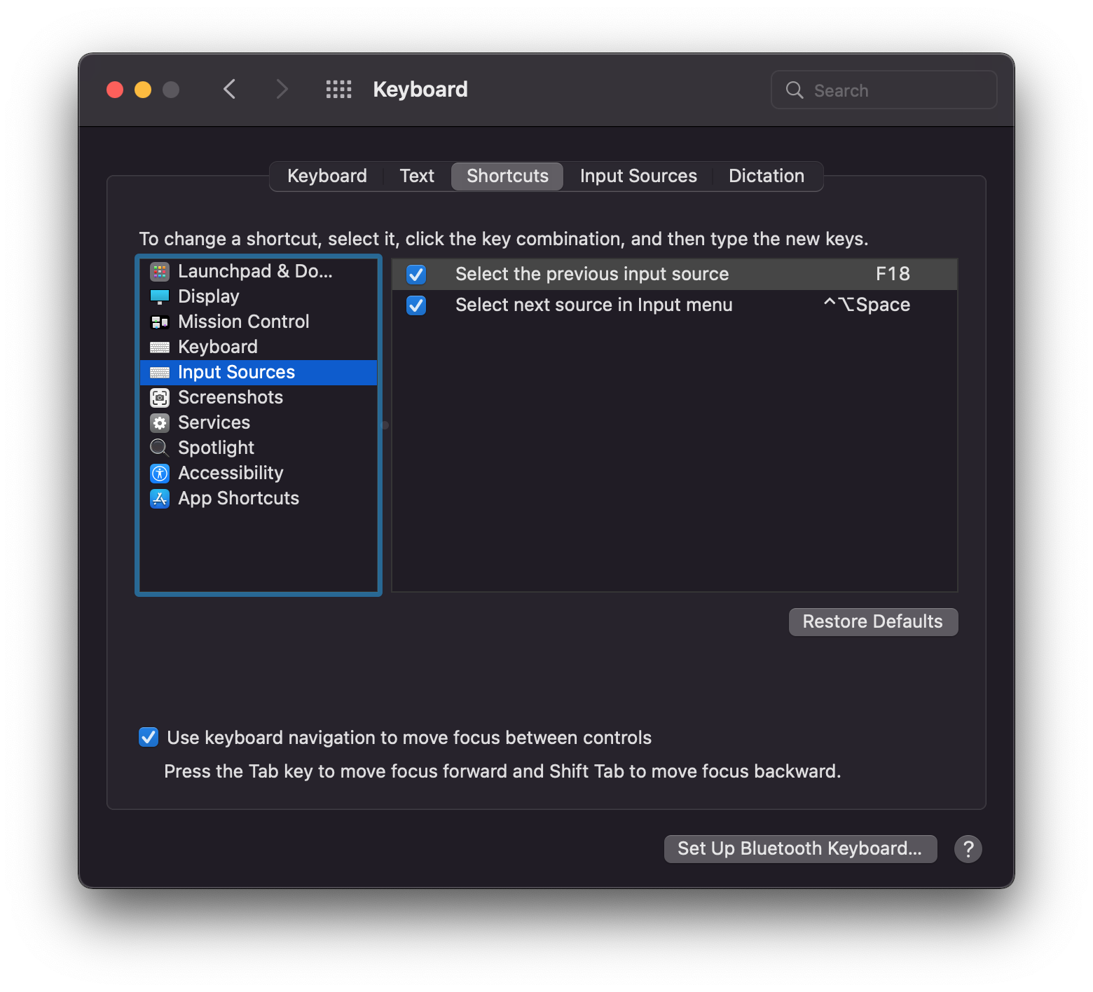 Select the previous input source 부분을 더블 클릭한 다음 shift-space 키를 누르면 F18로 설정된다.